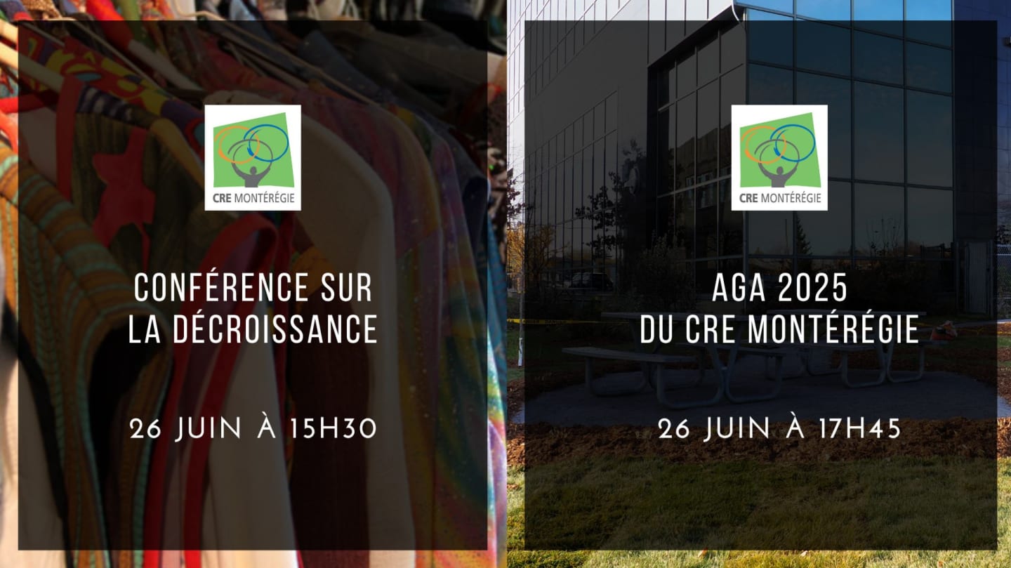 Le Conseil régional de l’environnement de la Montérégie (CRE Montérégie) souhaite profiter de son Assemblée générale annuelle (AGA) 2025 pour vous convier à une conférence inspirante sur le thème de la décroissance, qui explorera ses principes et ses enjeux. Cette réflexion collective s’inscrit dans une volonté d’élargir le dialogue sur les modèles économiques durables et les avenues possibles pour une transition juste et résiliente.