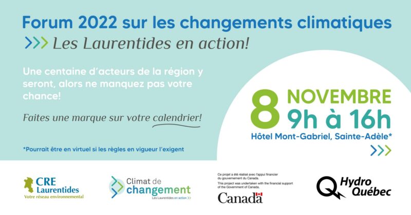 Le Conseil régional de l’environnement des Laurentides (CRE Laurentides) est fier d’annoncer la tenue du Forum 2022 sur les changements climatiques: Les Laurentides en action! et invite les acteurs municipaux à s’y inscrire en grand nombre. L’événement se déroule dans le cadre de la démarche Climat de changement financée par le gouvernement du Canada et compte Hydro-Québec parmi ses principaux partenaires.