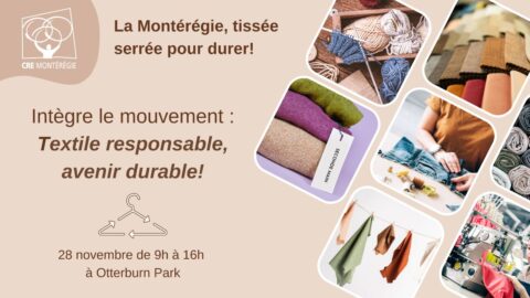 En collaboration avec ses partenaires, le Conseil régional de l’environnement de la Montérégie organise la journée thématique Intègre le mouvement : Textile responsable, avenir durable! dans le cadre du projet Montérégie, tissée serrée pour durer! Plusieurs activités seront proposées pour explorer le voyage d’un vêtement autour du monde, découvrir le potentiel du gisement textile montérégien, en apprendre davantage sur les initiatives circulaires inspirantes et participer au prototypage d’une partie du plan d’action régional.