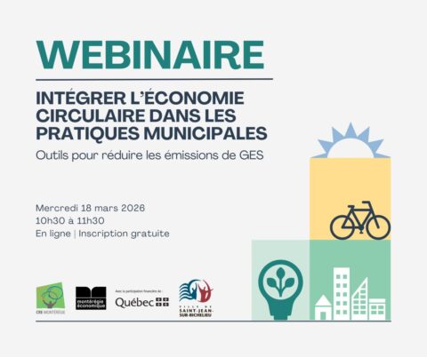 Le Conseil régional de l’environnement de la Montérégie (CRE Montérégie) vous invite à son webinaire qui présentera la boite à outils développée dans le cadre de son projet Outils pour réduire les émissions de GES : l’économie circulaire au service des municipalités !